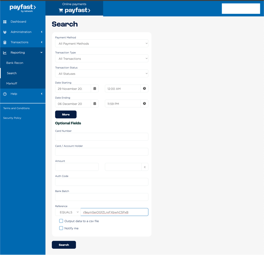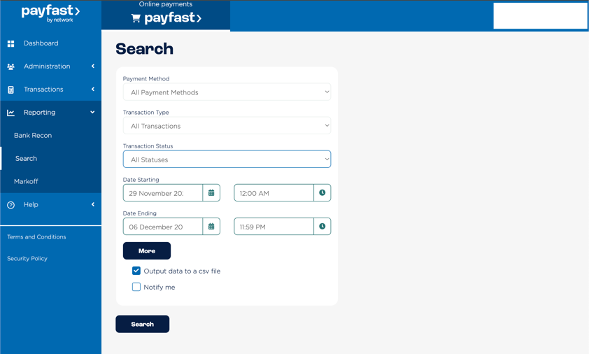 - Log into your Paygate Dashboard and navigate to Reporting -> Search and click the More button.