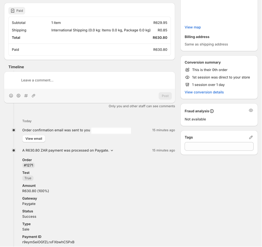 - In the Order Timeline, find the line that says: ‘A R_ ZAR payment was processed on Paygate’.